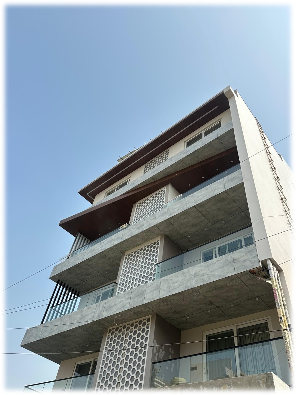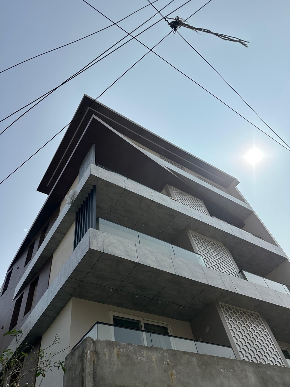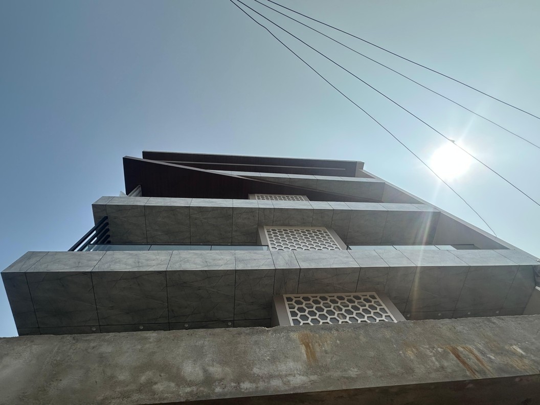 This features a modern facade with HPL SYSTEM . The facade is composed of HPL panels framed within a sleek aluminum grid, providing a streamlined, minimalist appearance. The facade design provides both aesthetic appeal and functional aspects like natural light penetration and excellent ventilation. This residential bungalow has been thoughtfully planned to deliver a perfect balance of style, comfort, and functionality. The design approach focuses on creating a serene living space that complements modern lifestyle needs while maintaining privacy and openness.